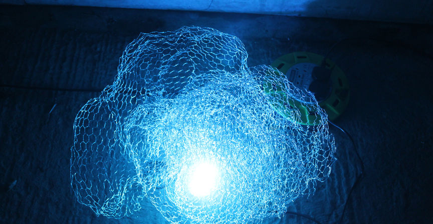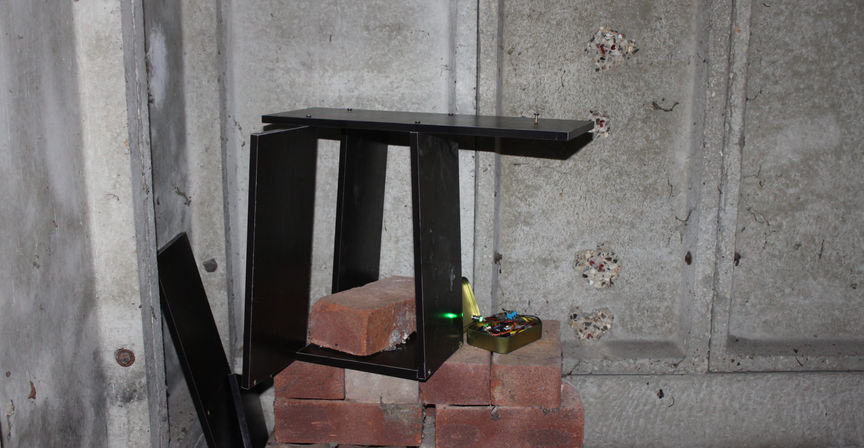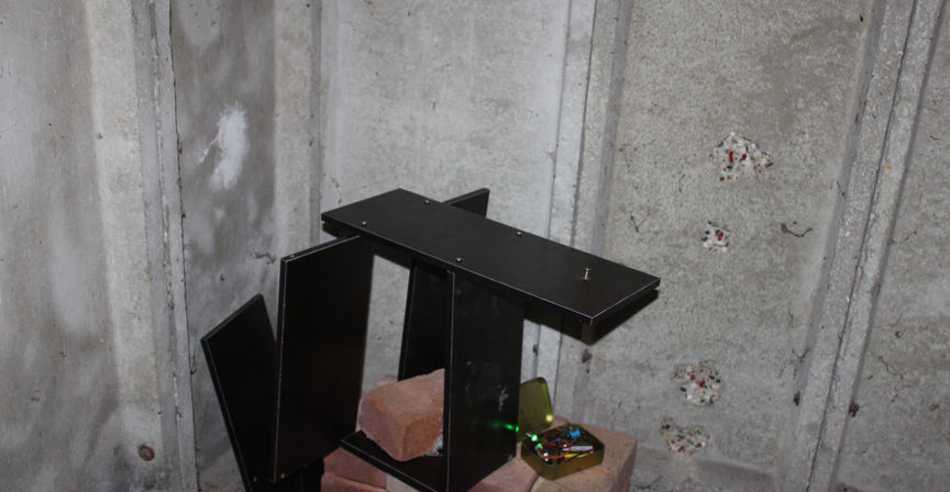 The main methods I chose to portray the materiality and space were audio composition and light. Firstly, I recorded different sounds inside the garage, scrapes, bangs, and impulse responses. Then, once I had my materials, I processed them, removing most of the high frequencies. This was done to enlarge the relatively small space. Low frequency sounds are generally imagined to be larger than high frequency sounds. The resulting track was then played back into the garage space in mono, through my HS8. The high frequencies were then created from the same low-frequency track albeit through a transducer set into a small metal tin. As the low frequencies rumbled inaudibly through the transducer, they rattled the small tin and mimicked the sonic rises and falls that occur in the track. The large speaker and the transducer are then placed in opposite sides of the space to create a stereo piece. Leaving a space interrupts the flow between these two sources, adding to the sense of unease within the garage. The resulting sound is now a combination of the original garage sounds (with the original reverberation of the garage), the processed, stretched audio in the track, high frequencies from the material of the tin, all engulfed in the real-time reverberation of the concrete garage walls and large sheet metal doorway.